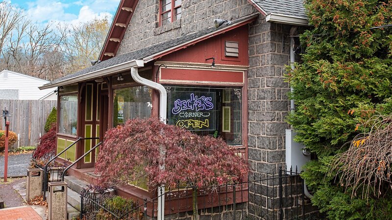 Cheeseburger topped with mushrooms and bacon with a cocktail and a pint of beer